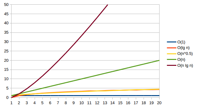 O(1)O(lg n)O(n)O(n lg n)Constant means that the algorithm is independent of input size (say indexing into an array). Algorithms that repeated divide their input in half generate a logarithmic order. Examples include binary search, and tree search algorithms. A linear algorithm is one that performs a constant amount of work for each item in the input.